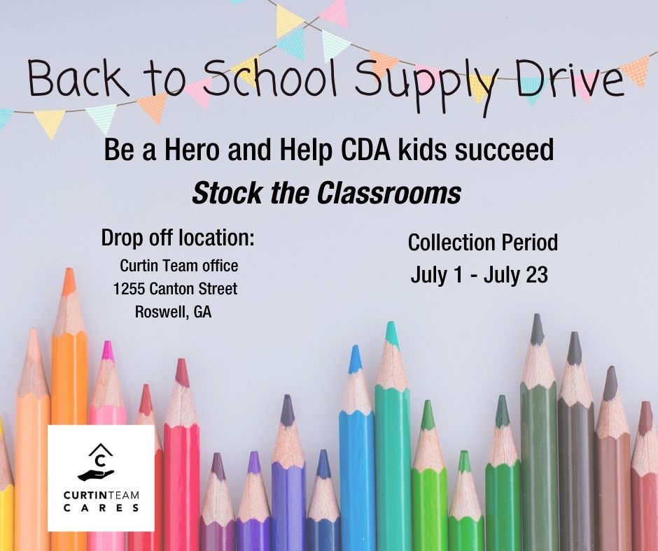 Curtin Team Cares is hosting a Back to School Supply Drive to support the Children’s Development Academy (CDA) in Roswell. The CDA helps nearly 160 local families get quality early education at little or no cost. Your donation of school supplies helps these children get an early start on success. Drop off your donations to our office at 1255 Canton Street Ste. A until July 23rd. You can also make a monetary donation at www.curtinteamcares.org