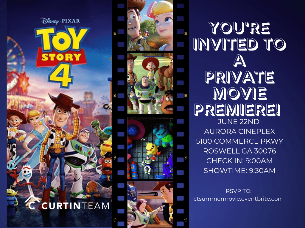 Join your friends and neighbors for an indoor morning with a private showing at Aurora Cineplex. We will be watching Toy Story 4! Complimentary for our clients and friends. Showtime is at 9:30am, and check in will be from 9am-9:20am so make sure to arrive early to get your wristband and complimentary family popcorn! Pajamas and costumes are welcome! RESERVE TICKETS