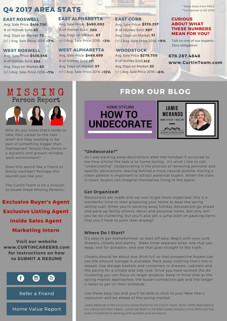 This edition of The REAL Review includes Q4 2017 Home Sale stats for Roswell, Alpharetta, Woodstock, and Marietta. Check out the numbers below and call or email us if you have questions about the values in your area.