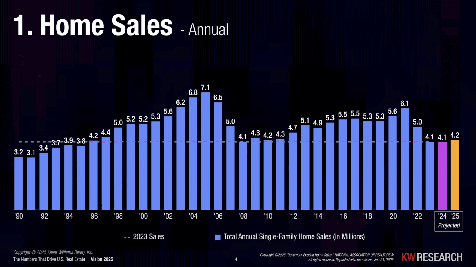 The real estate market is definitely feeling a slowdown, with home sales projected to be around 4.2 million in 2025—the lowest we’ve seen in nearly 30 years. That’s a big shift from what we got used to in the past decade. Now, historically, when the market dips like this, it takes about three to four years to fully bounce back, which means we may not see things feel truly ‘normal’ again until 2026 or later.